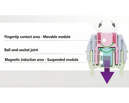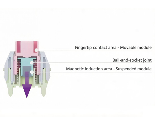 ![]() | State of lateral offset pressure When pressed laterally - The movable module automatically adjusts its deflection angle via the ball-and-socket joint, while the suspended module remains vertically stable at all times to prevent magnetic field deviation. |